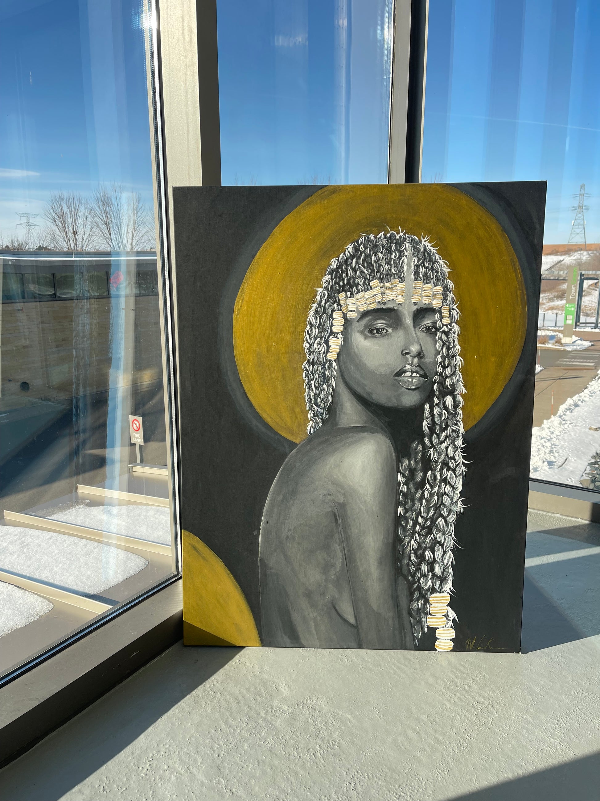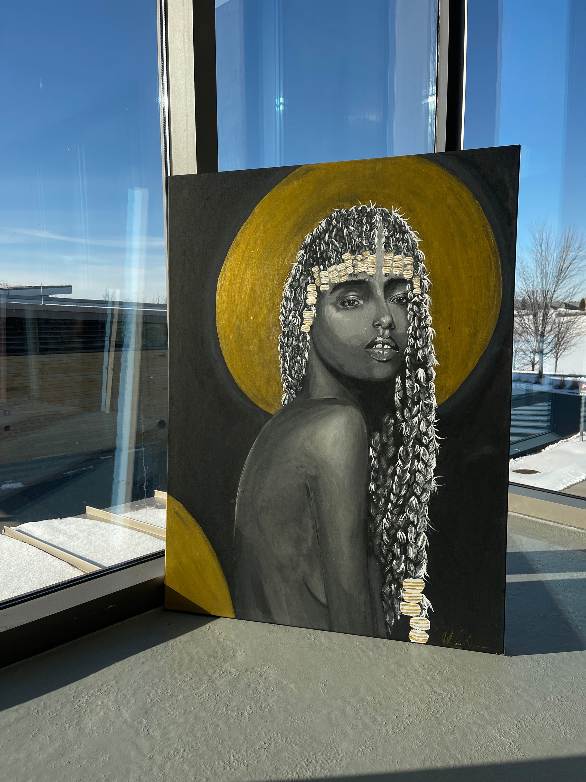 This painting is part of a three-piece series exploring African and Black American womanhood through hair and identity. Rendered in black and white with gold accents, it reflects history, resilience, and sacred presence. The contrast strips away distraction, allowing strength, beauty, and cultural pride to stand boldly on their own.