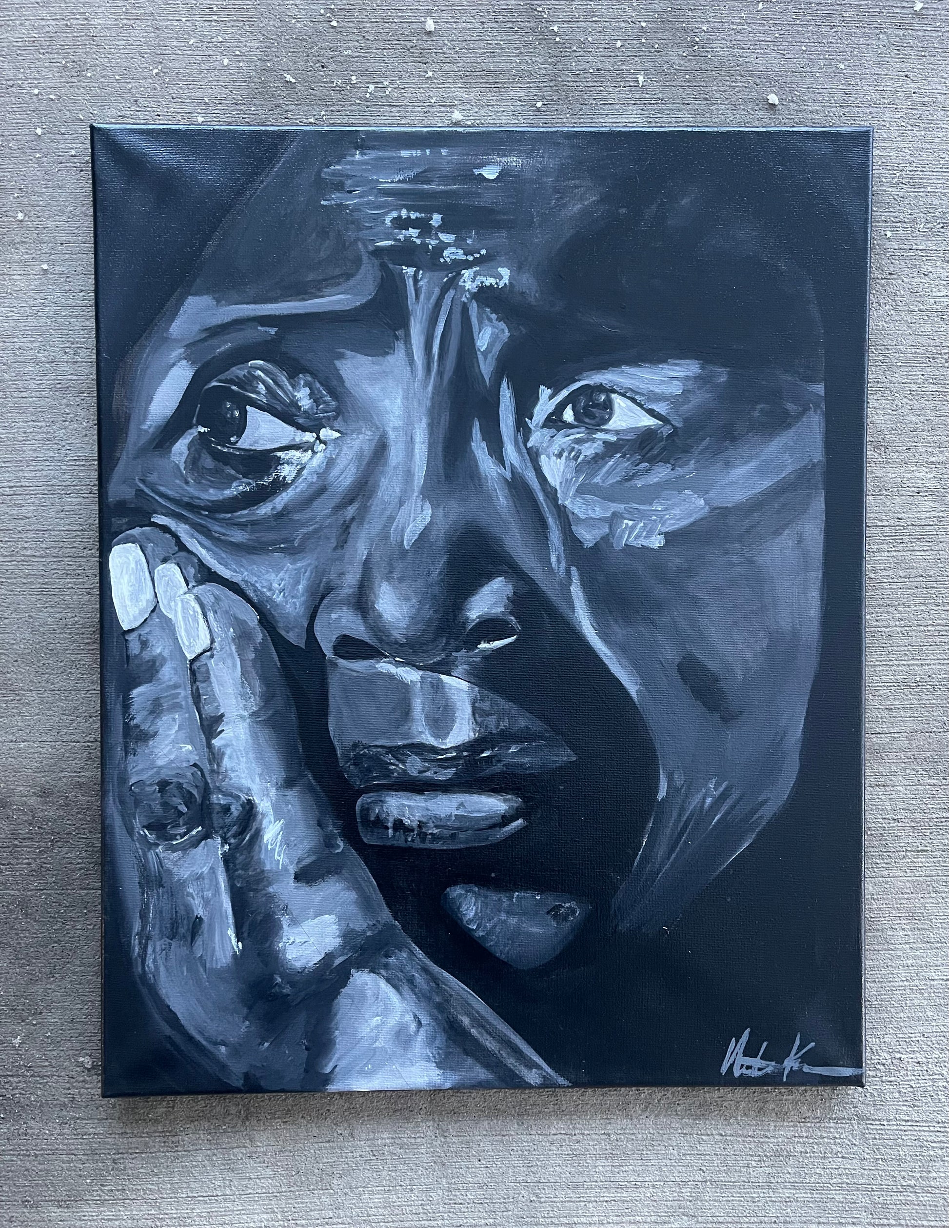 This close, intimate portrait confronts the viewer with raw presence. The exaggerated expression and direct gaze create an emotional exchange rather than a passive observation. The subject’s hand against the face suggests self-awareness